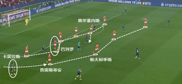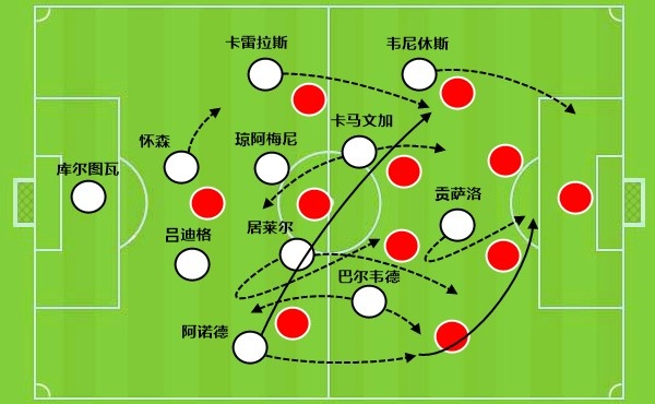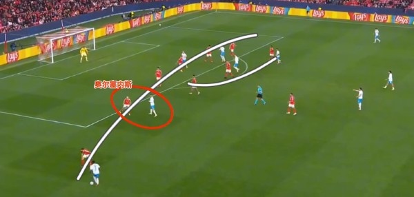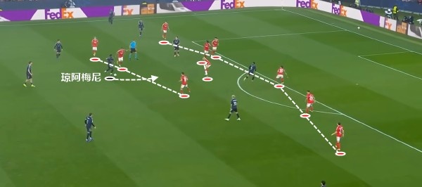 这一次的进攻,最初来自于琼阿梅尼的远射,在被封堵之后,皮球转移到侧翼,随后传中球打禁区后点。