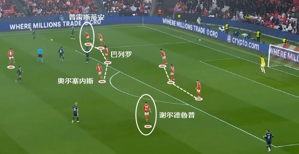 这一波的防守,最初就是边锋普雷斯蒂安尼退防到边后卫身侧限制拿球的卡雷拉斯。皇马这边回传后,本菲卡又让后腰巴列罗卡在肋部,让皇马很难对禁区内发起进攻。