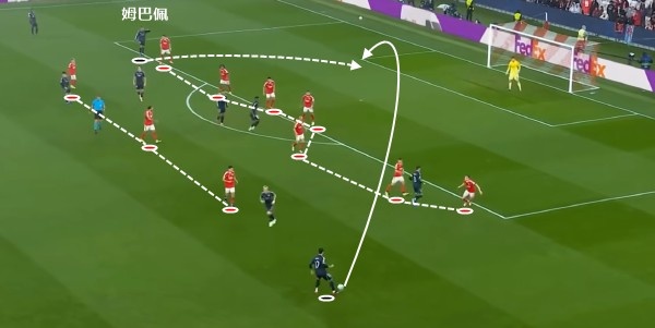 姆巴佩就是在面对对手偏弱的边后卫时,利用自己的速度和爆发力突然启动,甩开防守人头球破门。这样的打击方式原本是皇马最擅长的手段之一,只是姆巴佩一般情况下并不怎么喜欢接应传中球。如果他愿意多尝试,会是打击本菲卡的有效手段之一。